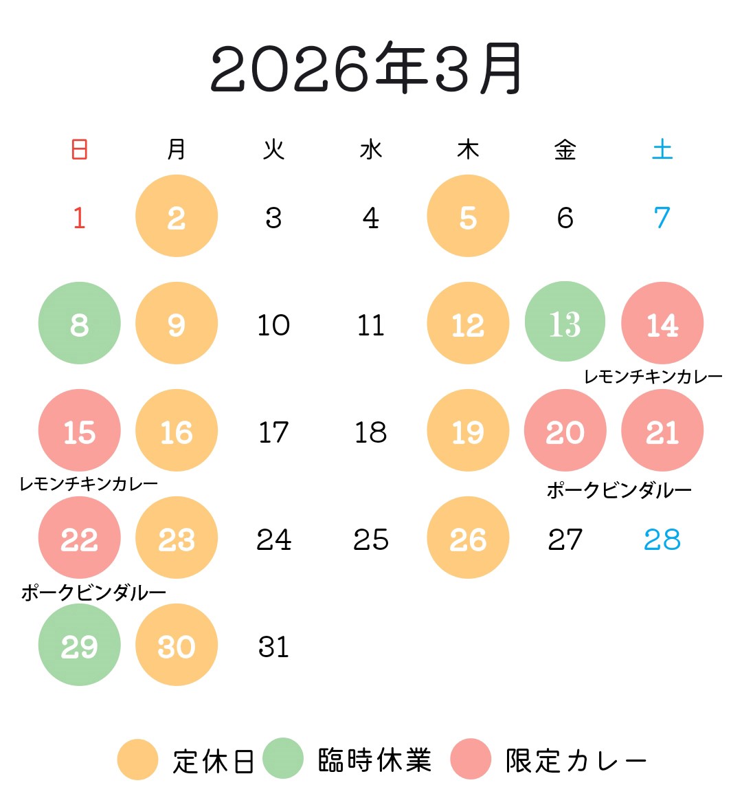 期間限定のカレーはその月の「営業カレンダー」に記載しておりますのでご確認ください。常時あるメニューではございません。